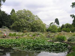 Cambridge botanic garden showing the lake and glasshouses Photograph © NHSavage